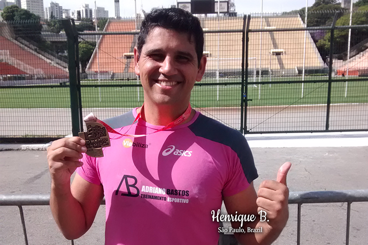 My name is Henrique B. I am passionate about the sport since the first race , which led me to have self discipline and determination in running, exercise and weight training.This season ( Jan/2013 ) I was still overweight 93kgs ( 205 pounds ) which affected my performance in the race . So I decided , from that month , that I would lose weight to run better . To conquer this task my goal was to have discipline and determination but I had another ally : The diet ( with the help of my mother ) I had a goal to achieve 70 kg to have a good performance in the marathon of São Paulo ( June, 10 2013 ) . Target achieved . Successfully completed my first marathon in 4:00:25 70 kg . A win !